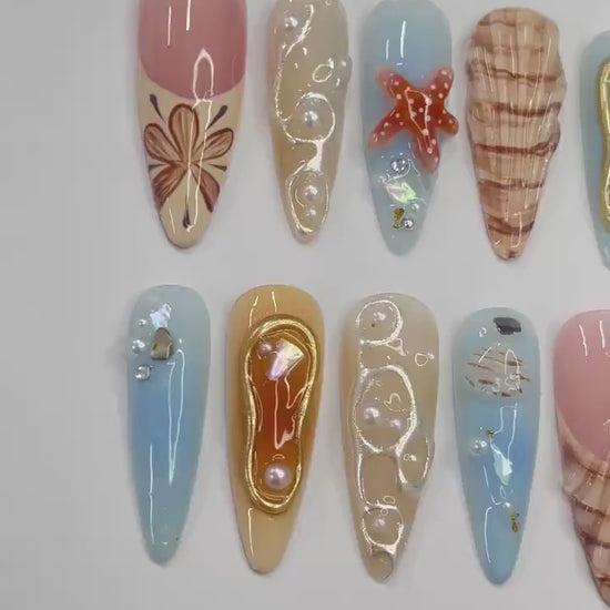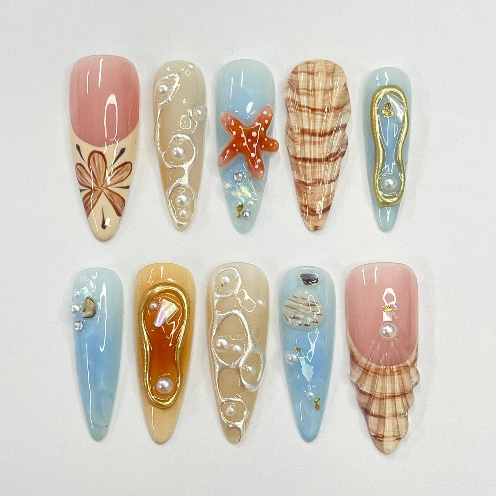 Dive into coastal chic with 3D Seashell Starfish Press on Nails! Vibrant 3D seashell and starfish designs. Easy to apply, durable, salon-quality for a stunning, beach-inspired look that sparkles.