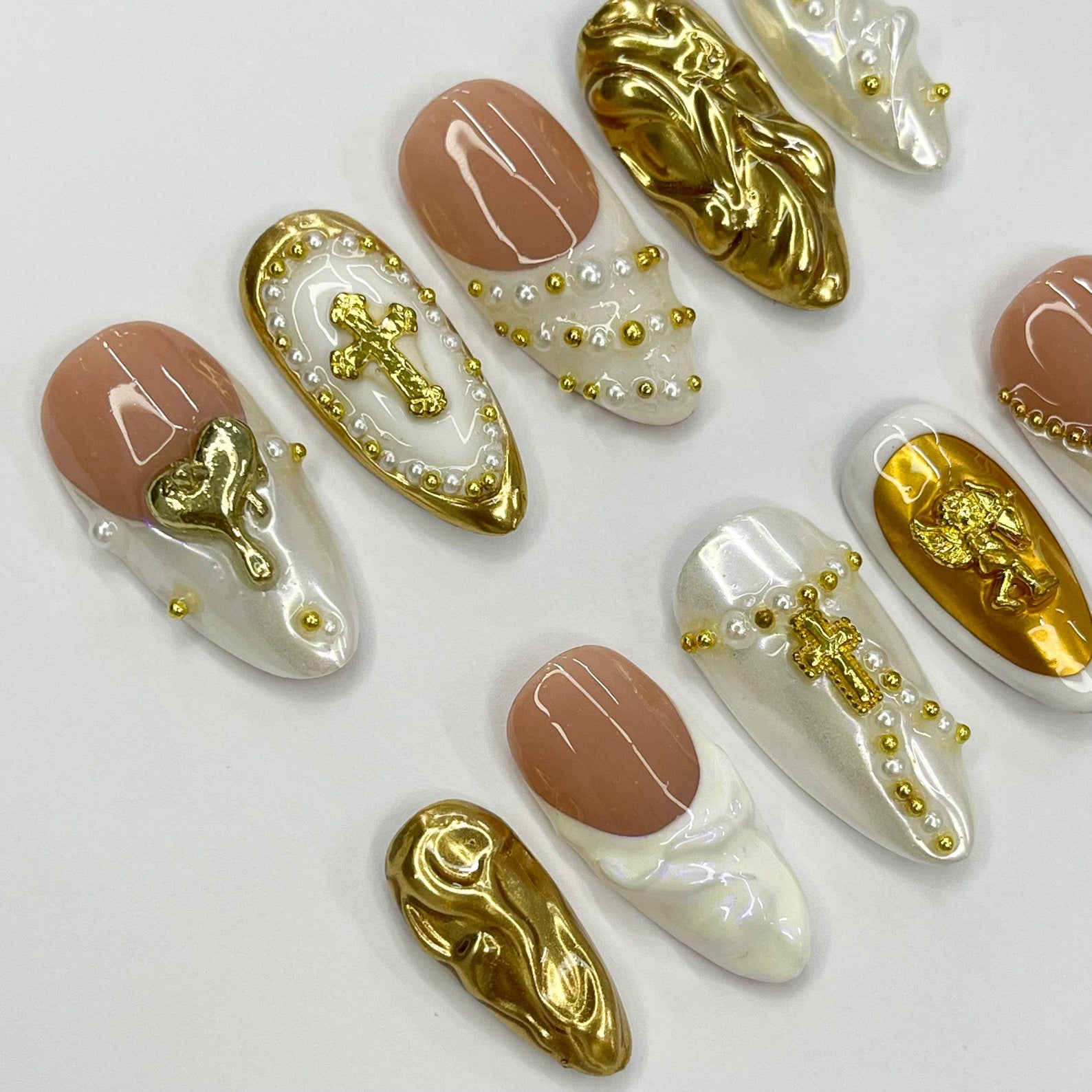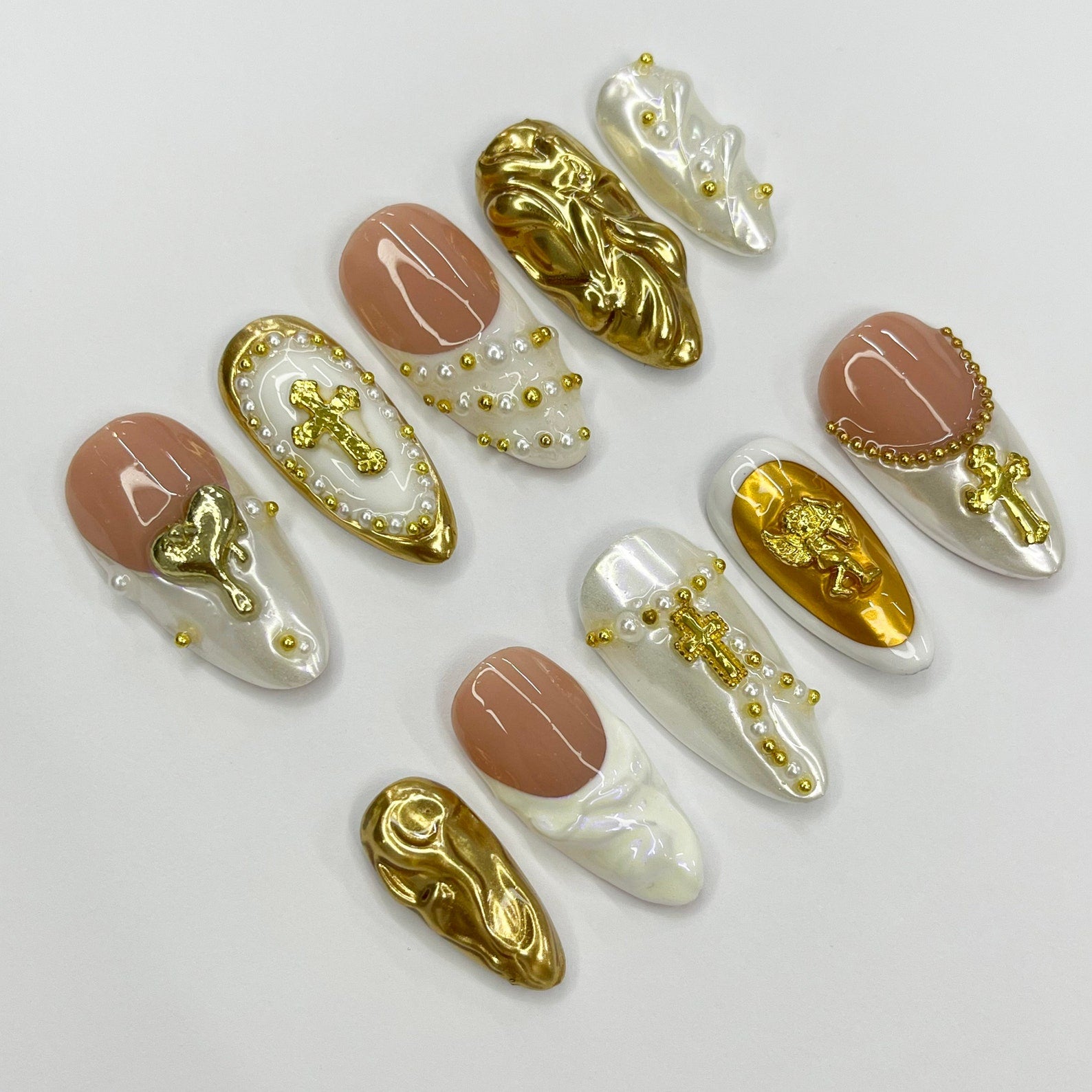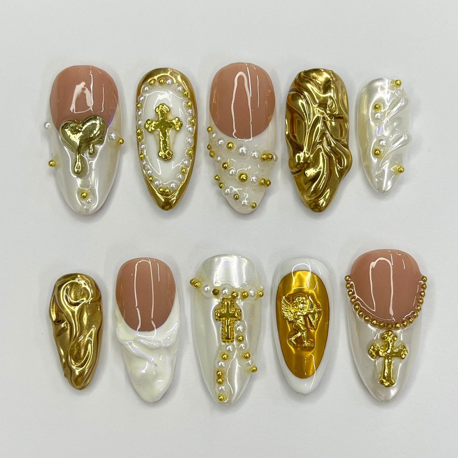 Unleash romance with Cupid With White Gold Press on Nails, featuring delicate cupid motifs and shimmering white gold accents. Effortless to apply, these nails elevate your style with timeless elegance.