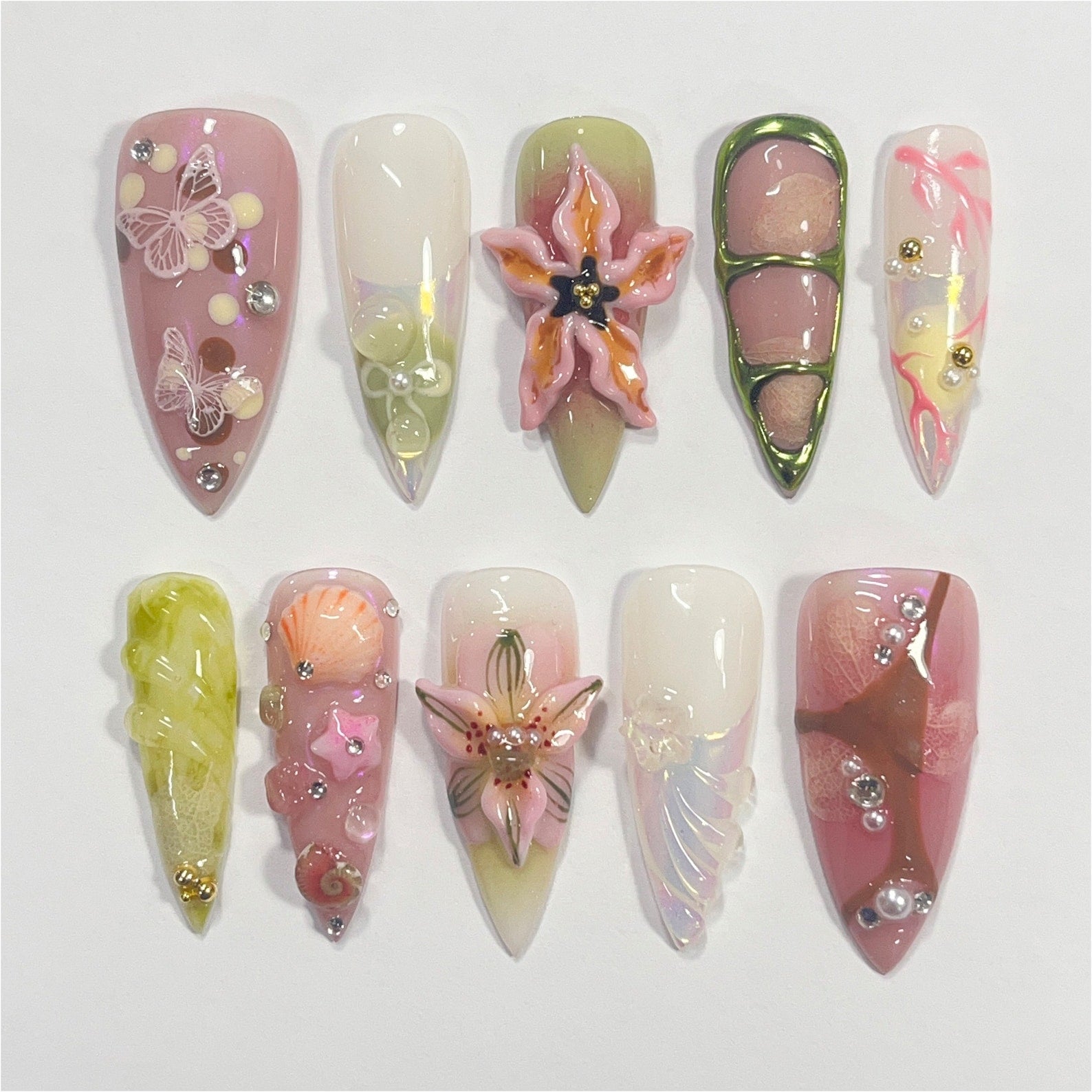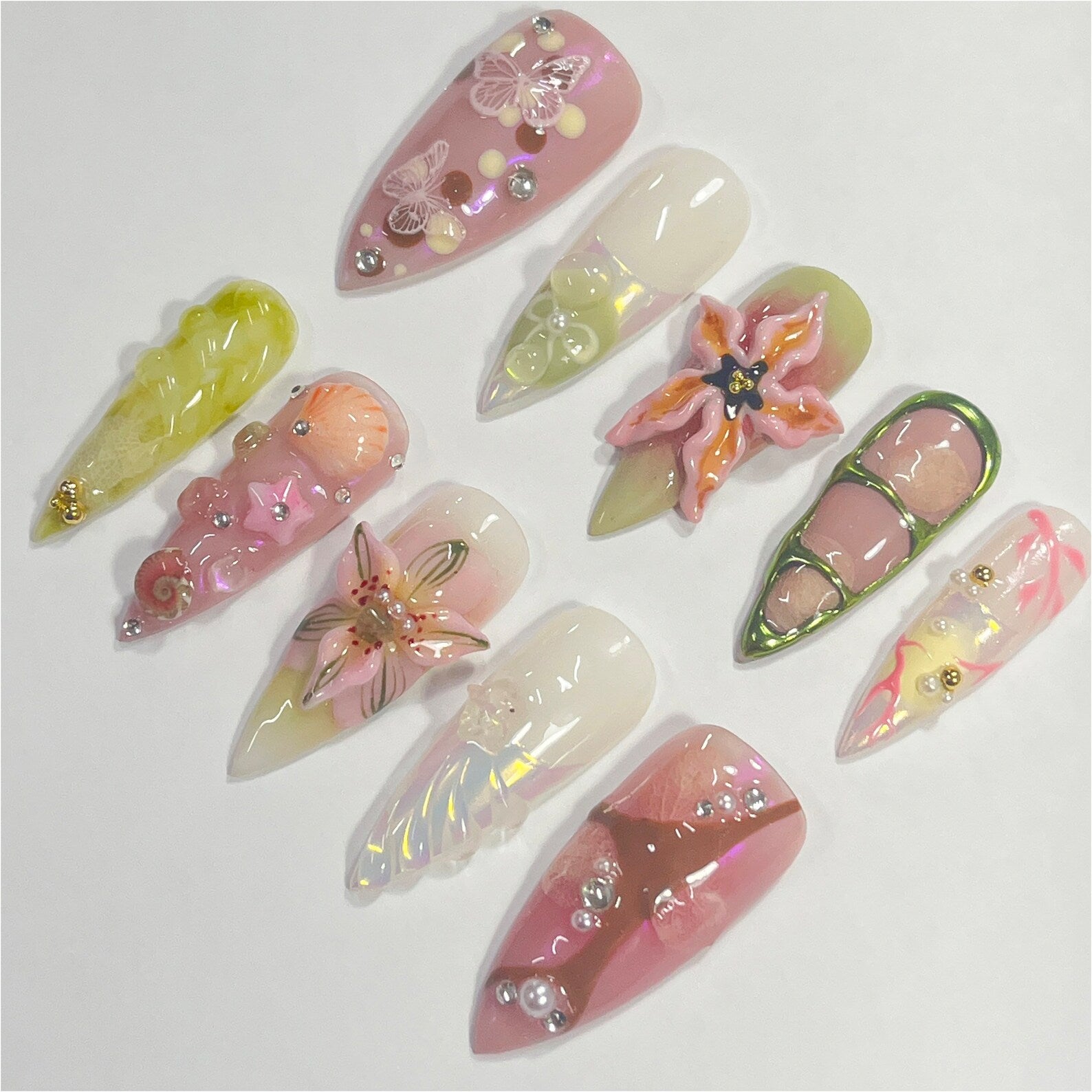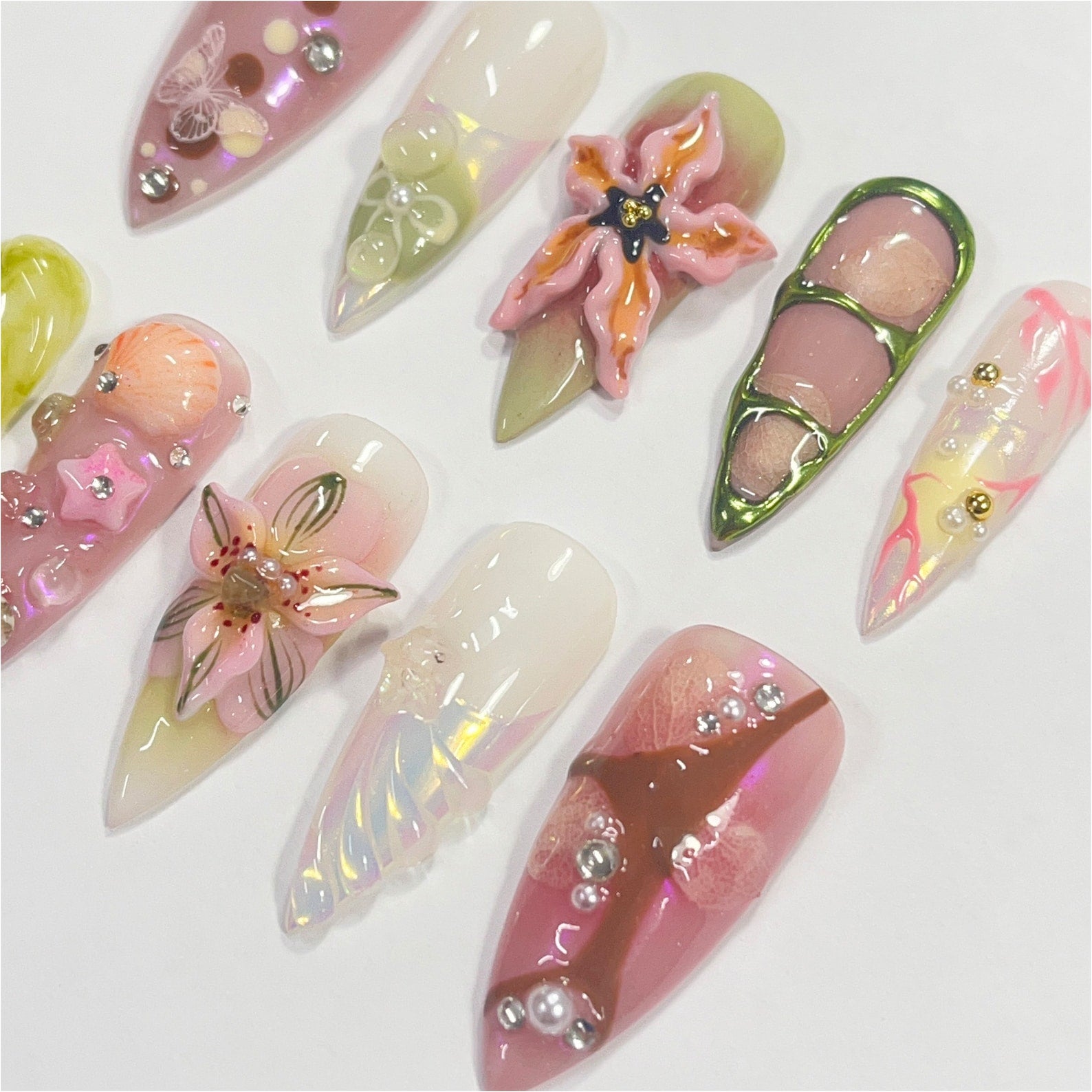 Tropical handmade press on nails by LushDigits bring vibrant island vibes and bold summer colors—perfect for effortless, vacation-ready beauty.