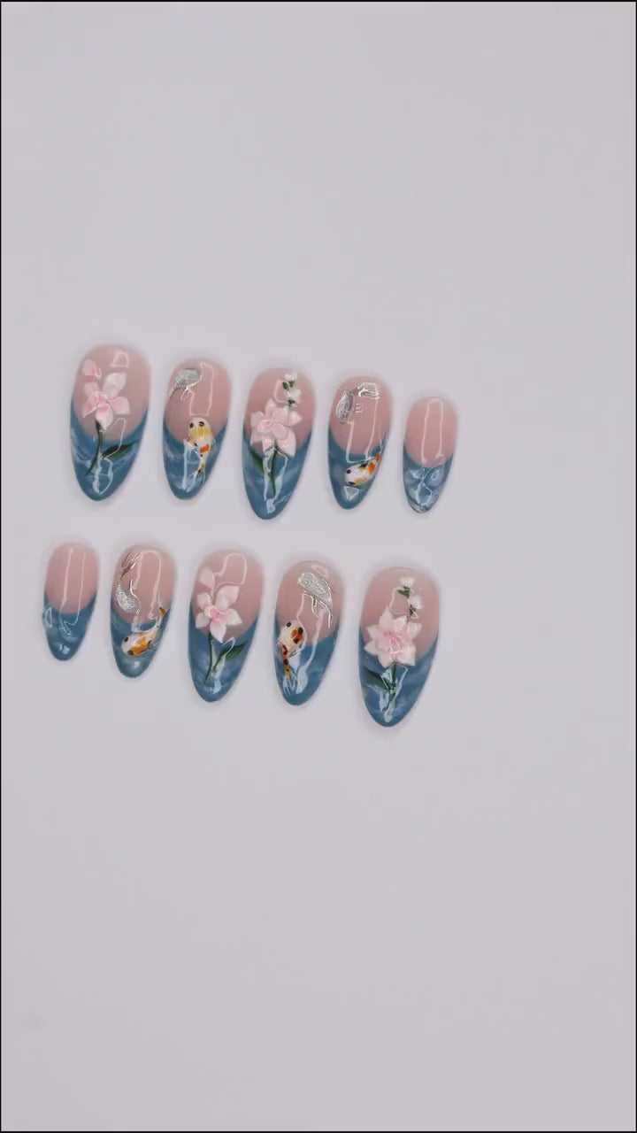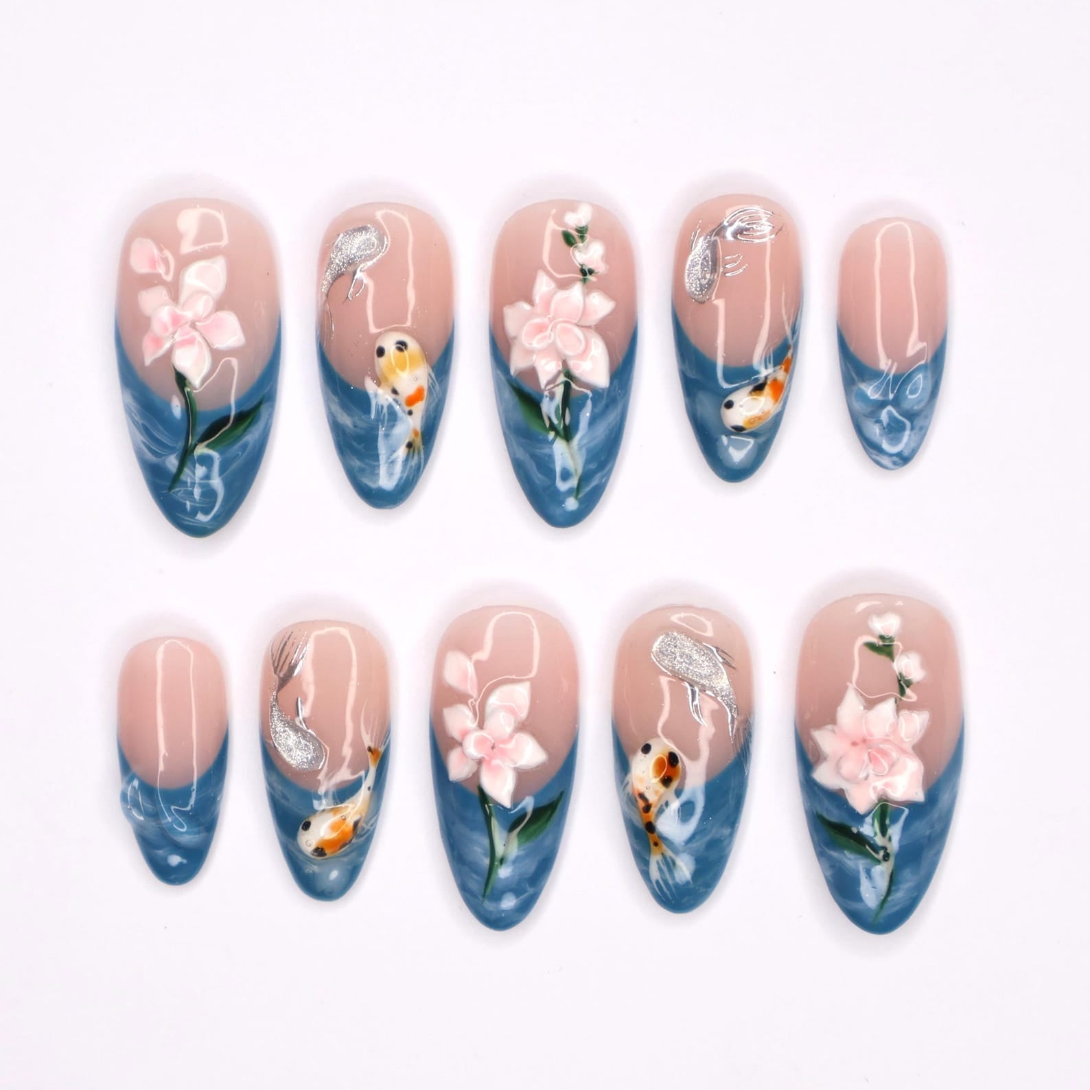 Immerse yourself in tranquility with Koi Fish Lotus Flowers Press on Nails, featuring hand-painted Koi and delicate lotus blooms in serene blues and pinks. Durable and reusable, these nails offer a zen-inspired, salon-quality look.