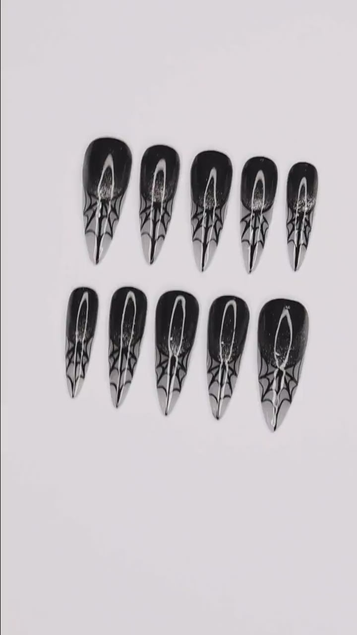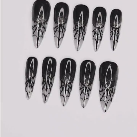 Embrace dark elegance with Spider Web Gothic Press on Nails, showcasing intricate spider web designs in shimmering black and silver. Reusable and easy to apply, these nails deliver a hauntingly chic, gothic allure.