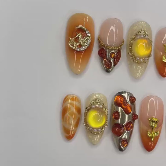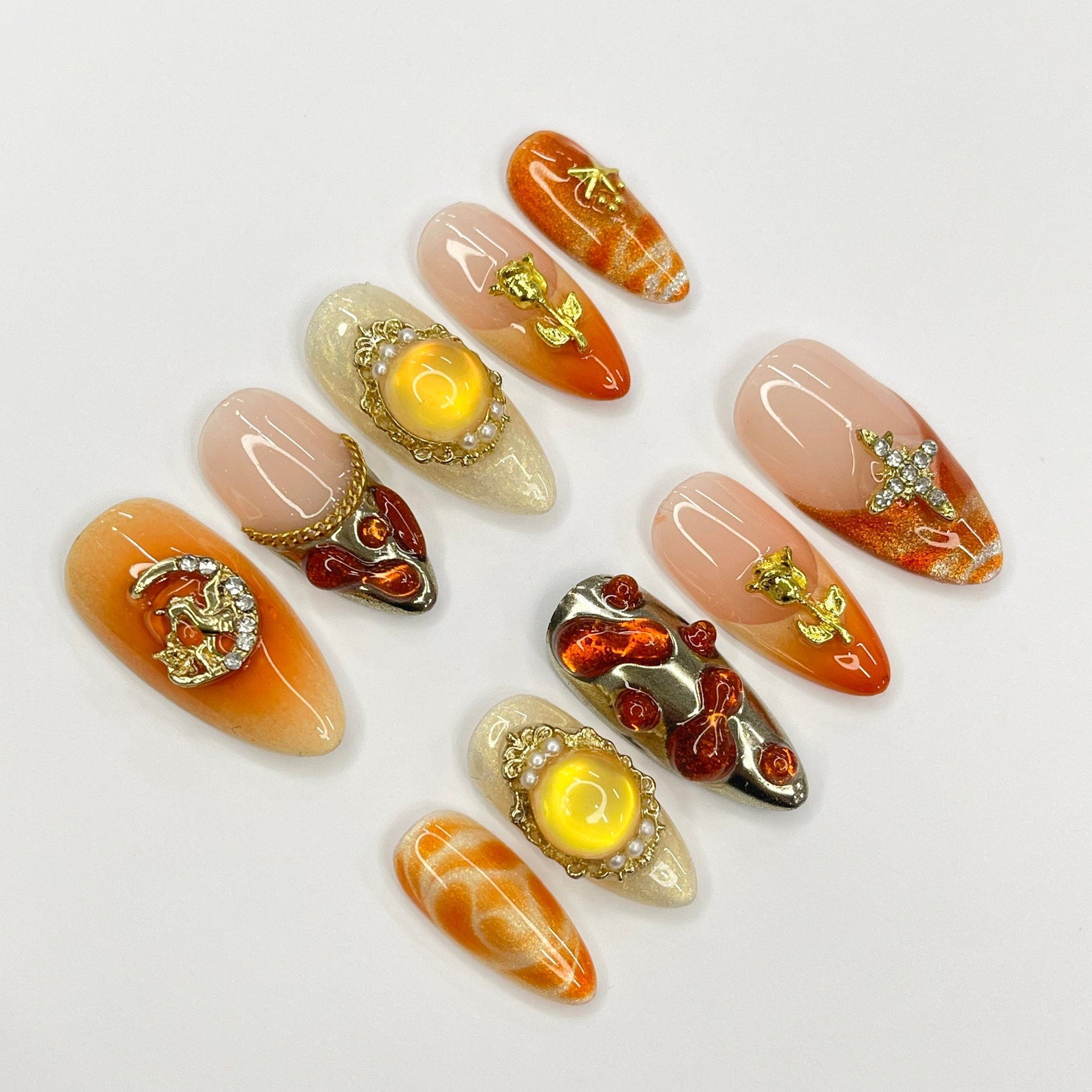 Embrace moody elegance with Sunset Autumn Gothic Press on Nails! Rich autumnal hues meet bold gothic designs. Easy to apply, durable, salon-quality for a striking, seasonal look that captivates.