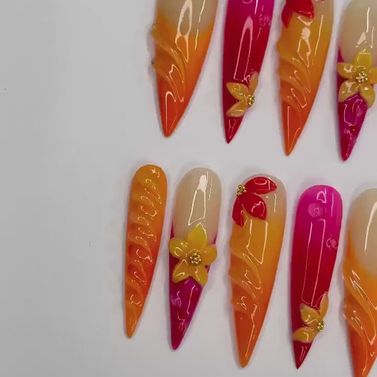 Bloom with elegance using Sunset Flower Press on Nails! Stunning floral designs in warm sunset shades. Easy to apply, durable, and salon-quality for a vibrant, chic look that lasts.