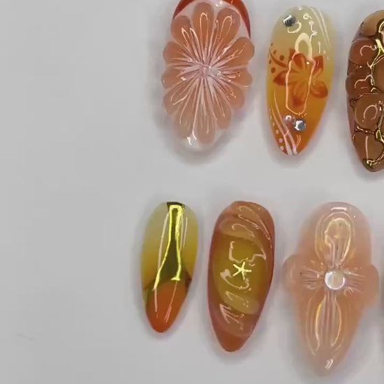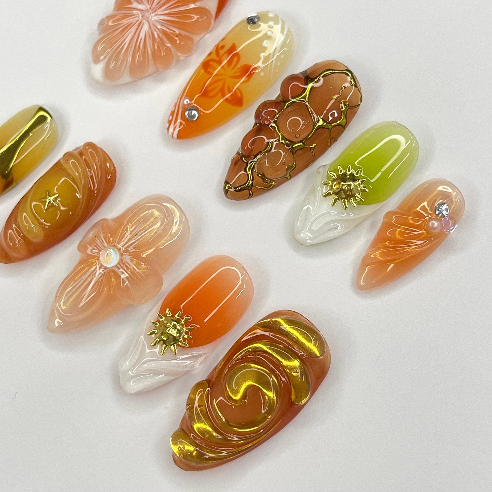 Capture the glow of dusk with Sunset With Orange Fruit Press on Nails, blending warm sunset shades with zesty orange fruit designs. Simple to apply, these nails radiate vibrant, summery chic.